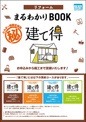 ビルダー様のチラシなどで「建て得」をご紹介いただく際にお使いいただける「建て得」広告データです。こちらも運用については別途、お知らせしているご注意点をご確認いただき、ご不明な点は、LIXIL営業担当まで直接お問合せください。