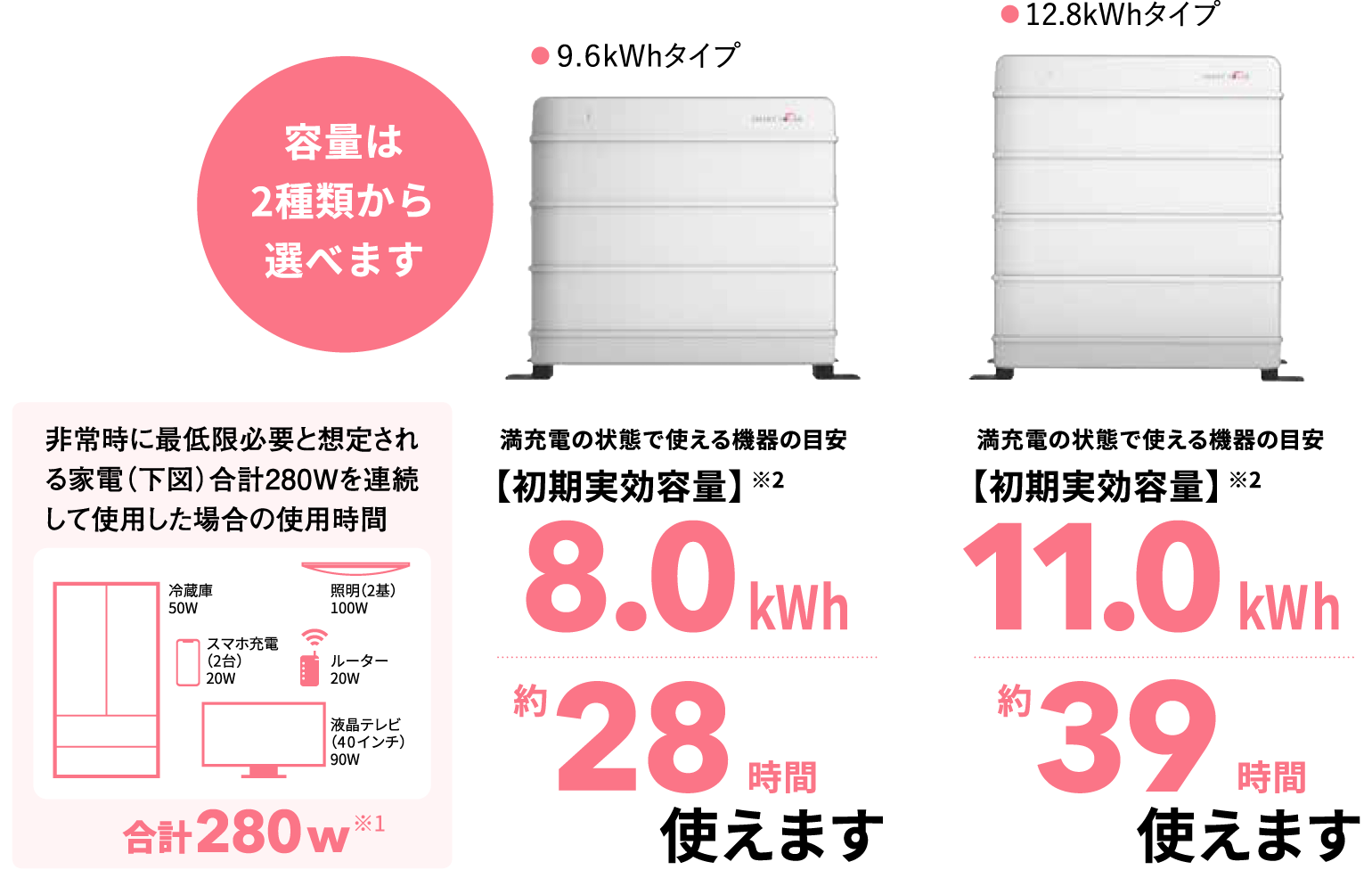 - 太陽光パネル設置容量4kWの場合で、スマート蓄電システムに接続された太陽光発電パネルが対象で、自立運転で最大5.5kW、充電で最大5kWの出力が可能です。
